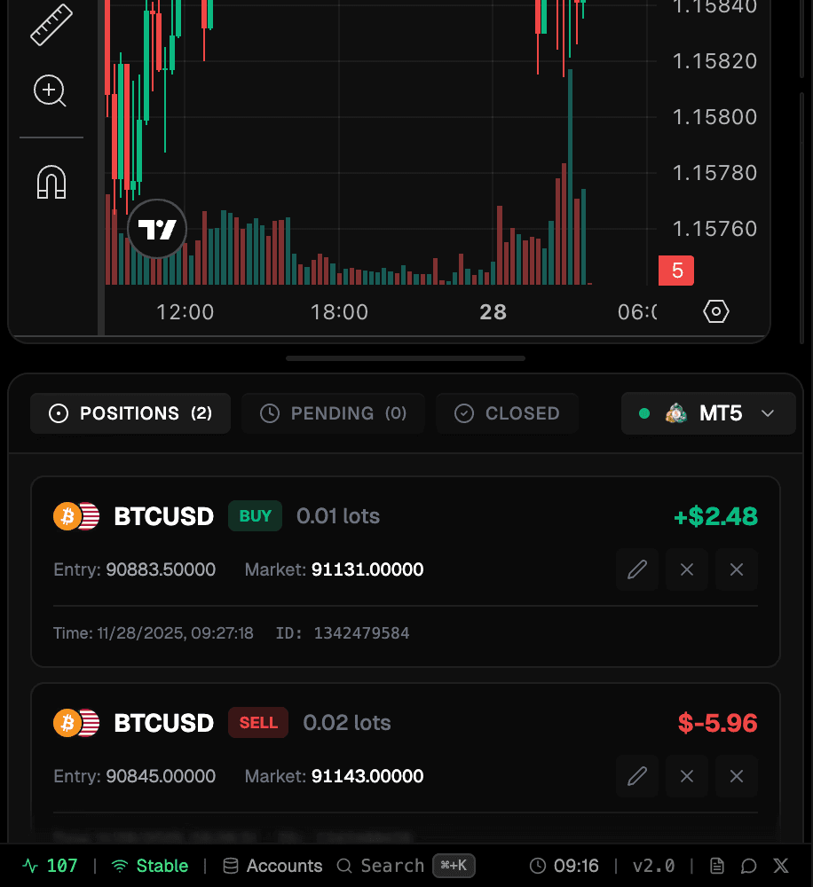 Trade, Automate, and Copy trades across MT4, MT5, and TradeLocker accounts.